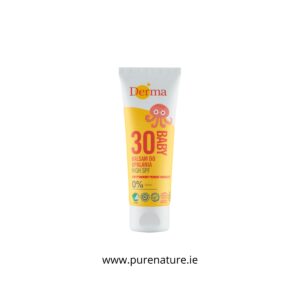 Balsam do opalania Derma Eco Baby SPF 30 High to wysoce wodoodporny, w 100 % naturalny hipoalergiczny produkt chroniący przed promieniowaniem słonecznym. Produkt przeznaczony jest dla dzieci i dorosłych z wrażliwą skórą. Sprawia, że skóra jest miękka i elastyczna i chroni ją przed wysuszeniem. Zawiera mineralny filtr słoneczny, tworzący fizyczną barierę skutecznie odbijającą promienie słoneczne.